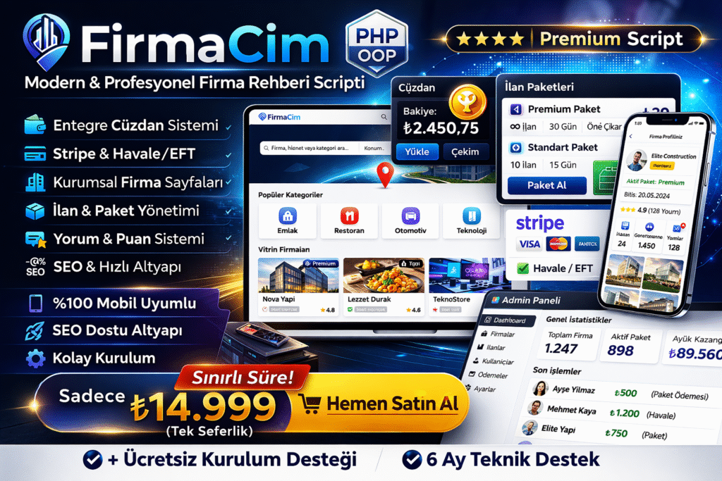 Kendi kurumsal şirket dizini, yerel işletme rehberi veya sektörel ilan portalınızı kurmak mı istiyorsunuz? FirmaCım, hızı, yüksek güvenliği ve %100 SEO uyumlu altyapısıyla öne çıkan, modern bir PHP firma rehberi scriptidir.